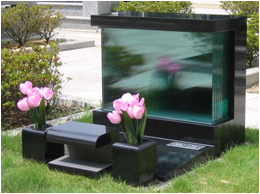 ガラスブロック、強化プラスチック等を墓石や外柵の一部に組み込み、納骨室の内部に四季の光やローソクの明かりが入射します。